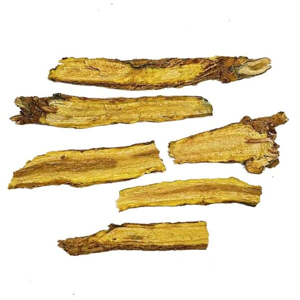 Mô tả cảm quan: Rễ thái lát, vỏ ngoài nhăn nheo, nhiều vết nhăn dọc, màu nâu sáng hơi vàng, lõi màu vàng nâu, nhiều xơ. Thể chất cứng giòn, dễ bẻ gãy. Không mùi, vị đắng.