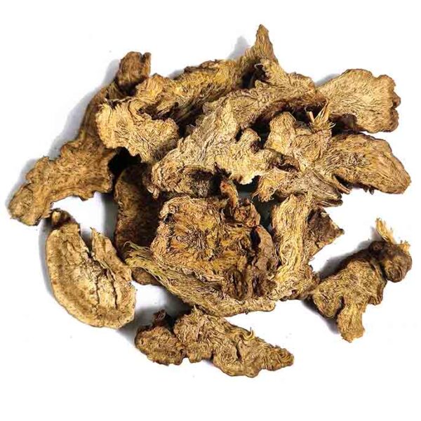Mô tả cảm quan: Thân rễ thái lát không có hình dạng xác định, phiến dày 0.1 – 0.5 cm, đường kính 1 – 6 cm, vỏ nhăn nheo, có vết tích của rễ con, màu nâu đến nâu đen, lõi màu nâu sáng, có xơ, thể chất cứng chắc, mùi đặc trưng, vị cay đắng.